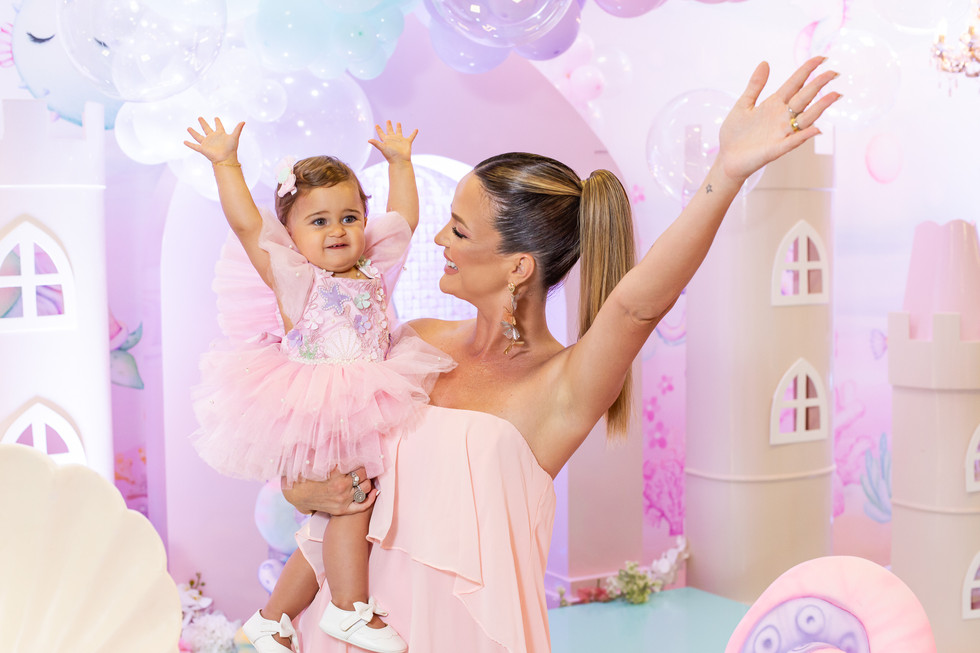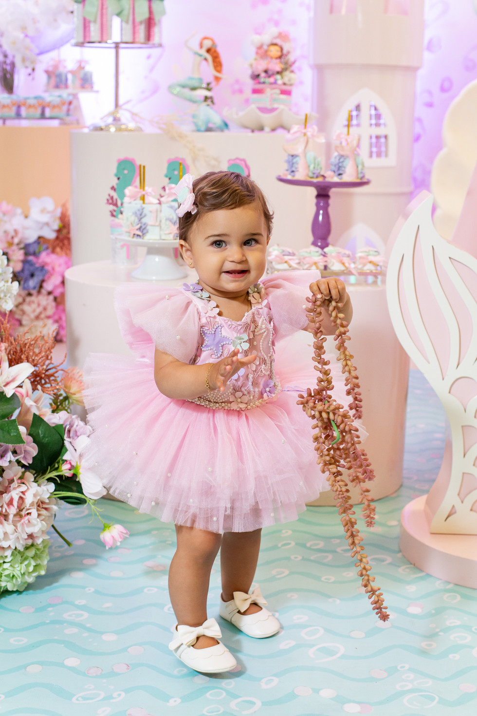 A aniversariante chegou com um vestido rosa magnífico, cheio de estrelas do mar. Estava radiante! Mega feliz, explorou cada cantinho da festa e aproveitou intensamente cada momento, espalhando alegria por onde passava.