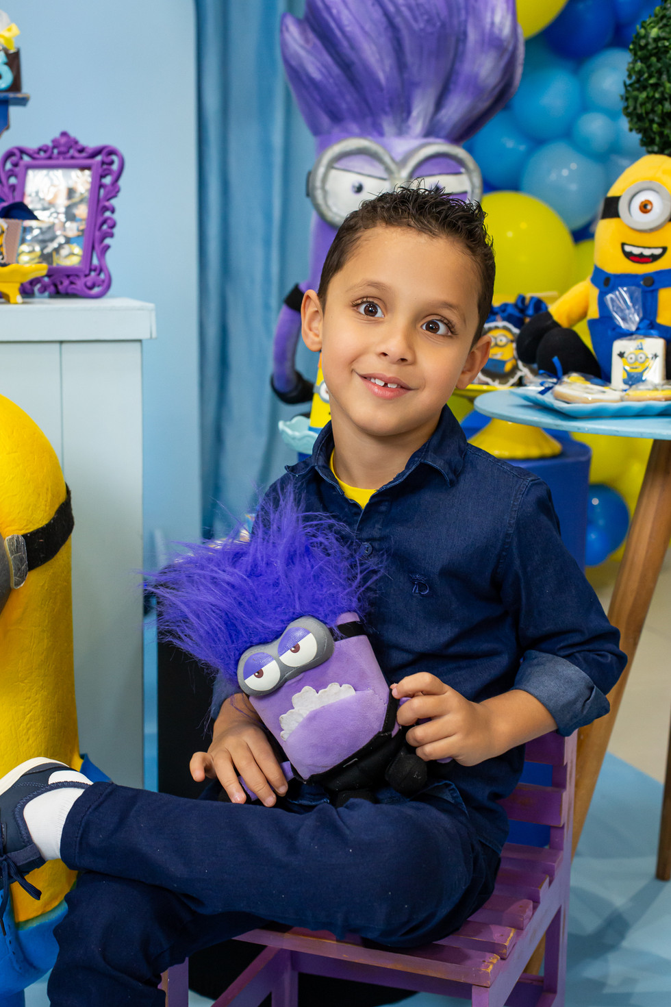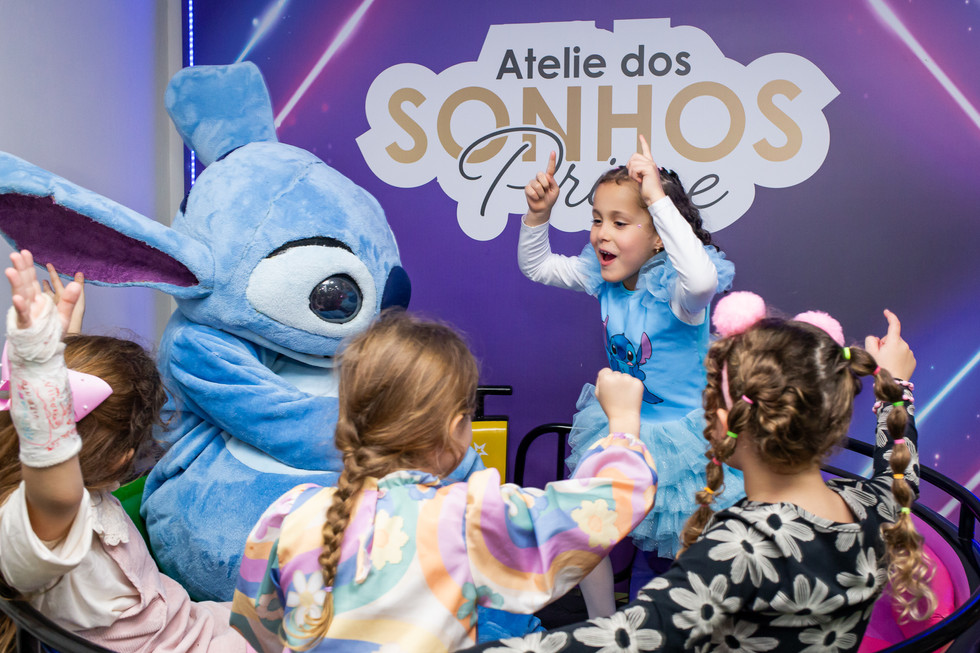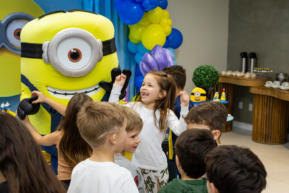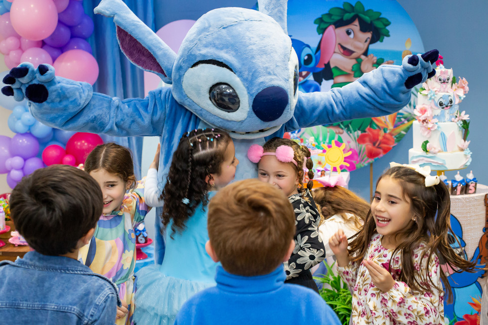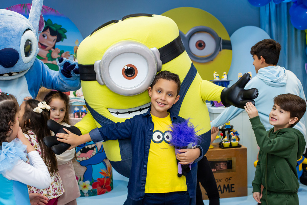 A animação tomou conta do ambiente! Os dois aproveitaram cada brinquedo do espaço com entusiasmo contagiante, e o ponto alto da festa foi a apresentação da Hello Heroes, que trouxe à vida os personagens Stitch e Minion. Crianças e adultos se encantaram com a interação, os abraços e a magia que tomou conta do salão.