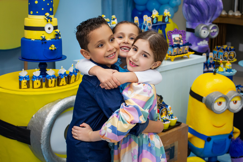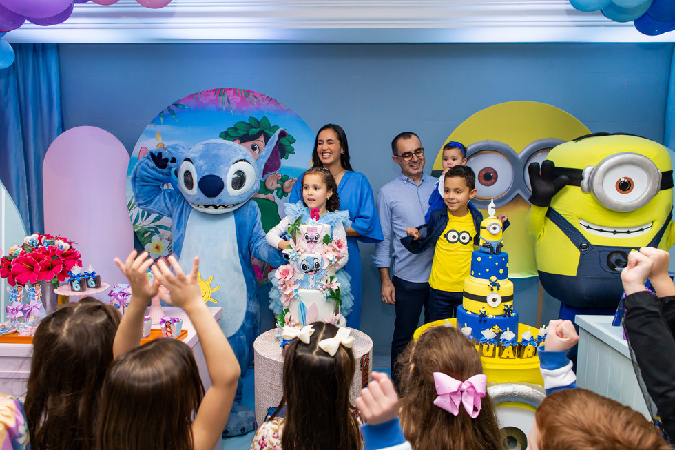 A decoração, assinada com capricho pela equipe da Decorativa Festas, trouxe dois mundos incríveis para o mesmo espaço: de um lado, o universo azul e fofo do Stitch, para a Laís; do outro, a energia amarela e divertida dos Minions, para o Eduardo. Cada detalhe refletia o jeitinho único de cada um — e juntos, criaram uma atmosfera vibrante e cheia de cor!