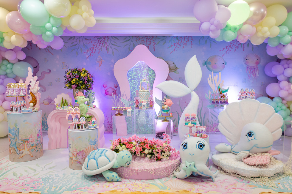 Dessa vez, o tema escolhido foi Fundo do Mar, inspirado na paixão da Laura pela música da Baleia. E não poderia ter sido mais perfeito! O Ateliê dos Sonhos Prime foi o cenário ideal para essa celebração cheia de magia, e a Raposo Festas caprichou na decoração, criando um ambiente lindo e encantador, digno de um verdadeiro mergulho na fantasia.