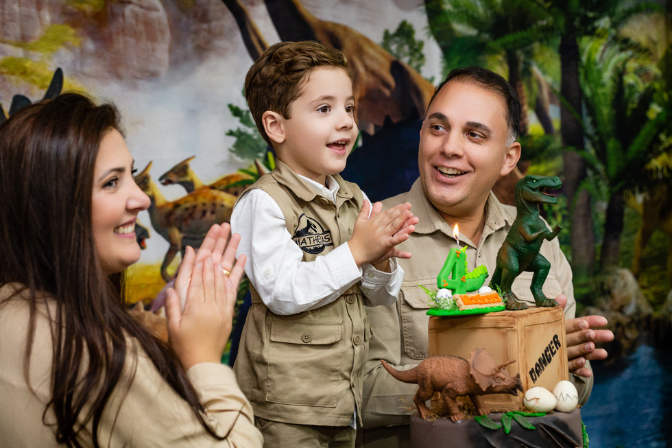 Hoje é dia do Matheus brilhar por aqui! Ele comemorou 4 anos de vida com uma festa linda com o tema Dinossauros realizada no Ateliê dos Sonhos. A decoração estava tão perfeita, que nos sentimos dentro do Jurassic Park. A família toda entrou no clima e vieram vestidos a caráter para explorar essa grande aventura! A criançada era pura animação! Brincaram e correram como se não houvesse amanhã!