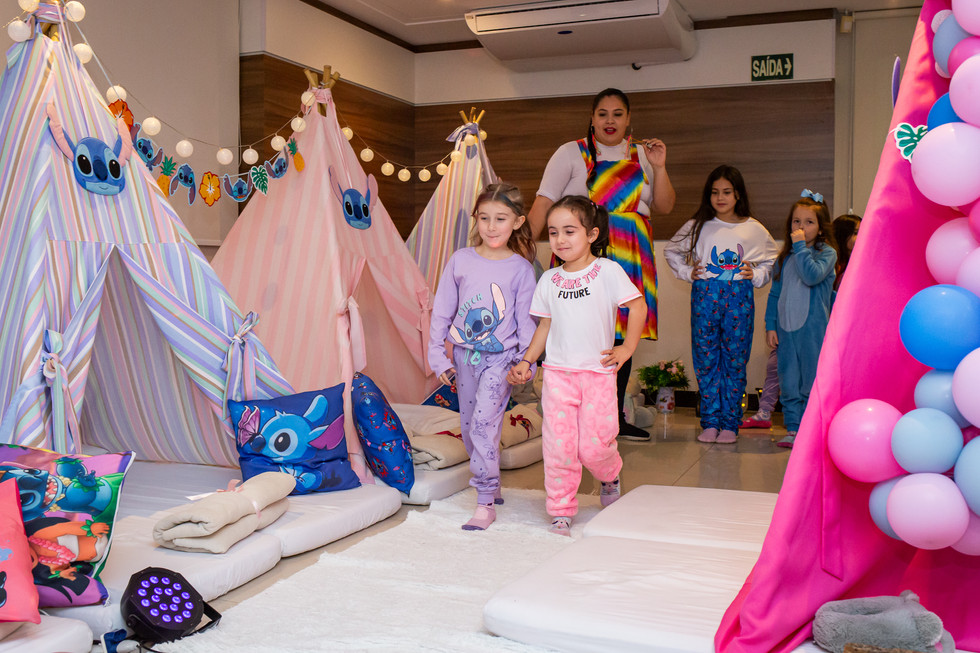 O salão de festas do prédio onde a família reside virou cenário de afeto e brincadeiras, com decoração inspirada no universo divertido de Lilo e Stitch, e claro, com um grande diferencial: todo mundo de pijama! Crianças, mamães e convidados desfilaram com seus looks aconchegantes, esbanjando simpatia e beleza enquanto mergulhavam na magia da festa.